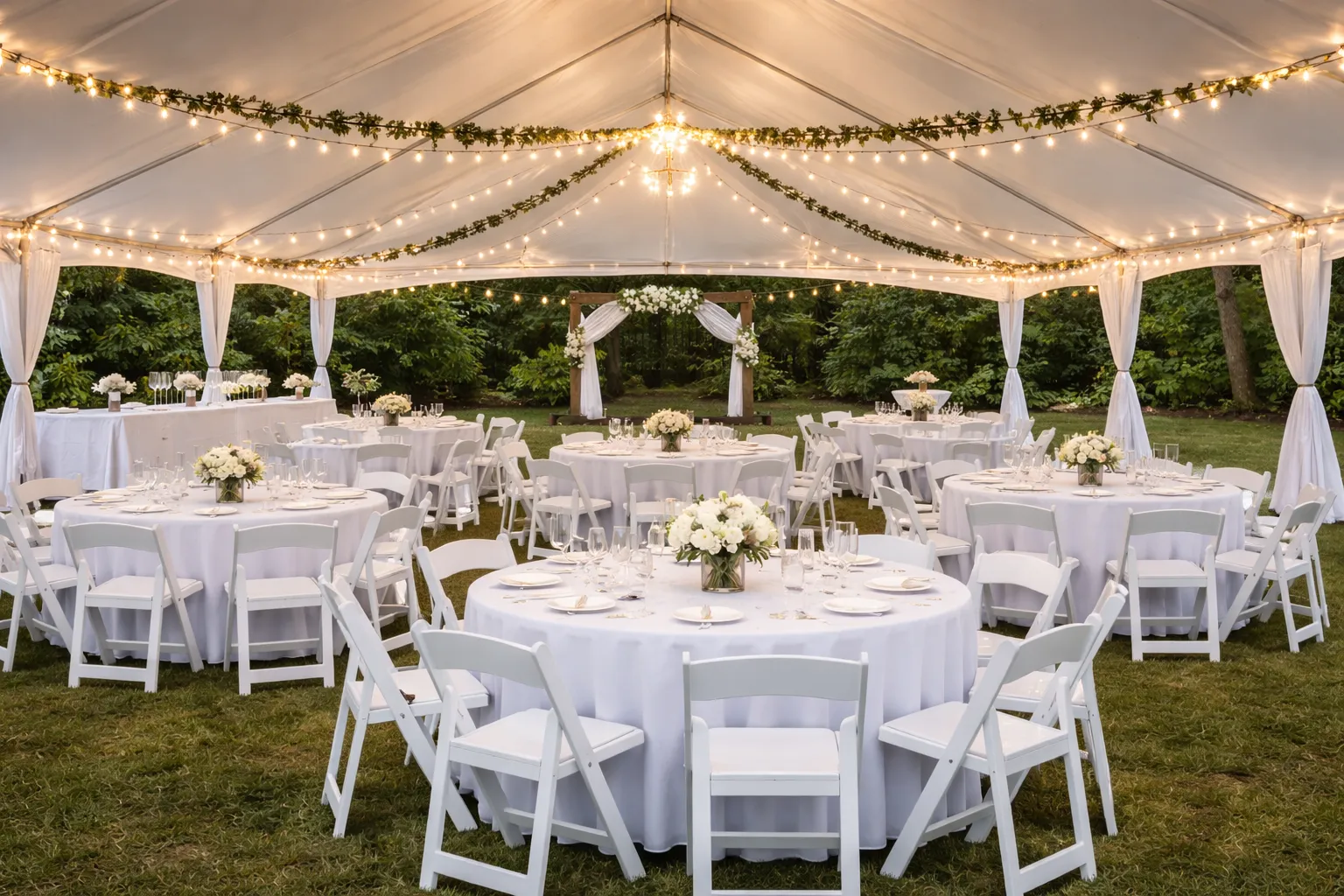 Backyard or private property. The most flexible option — you control the timeline, the vendors, and the setup. You'll need to bring in everything: tent, tables, chairs, lighting, restrooms (for larger guest counts), and possibly power. This is where a full-service rental company earns its value.